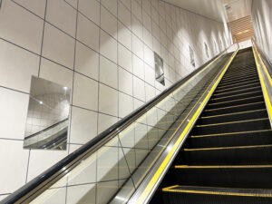 福岡市交通局では、エスカレーターでの盗撮行為の抑止と、利用者の皆さまが安心してご利用いただける環境整備の一環として、壁面への鏡の設置を進めており、七隈線櫛田神社前駅には後方を確認しやすいFFミラーを設置しました。